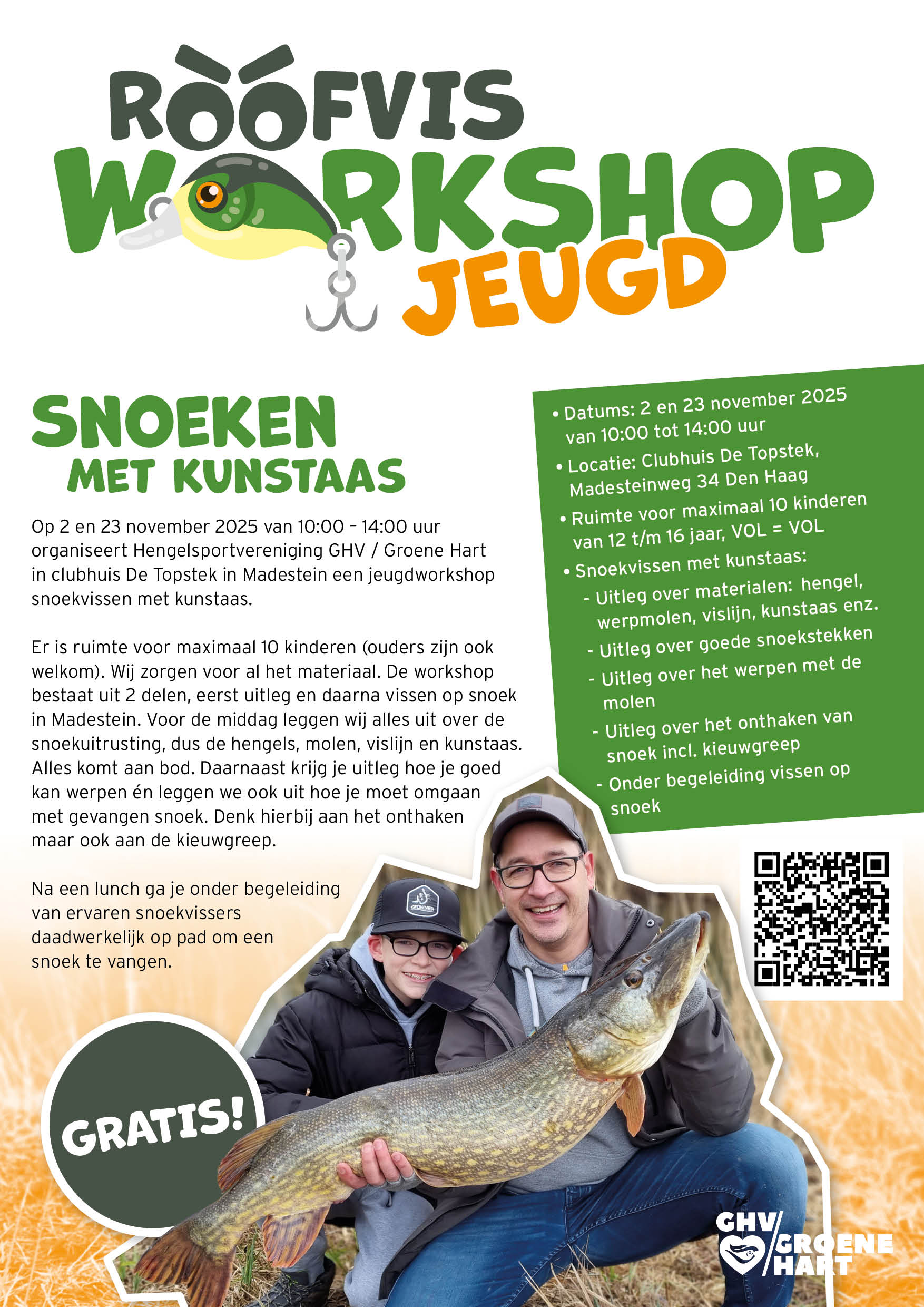 Op 8 november van 10:00 – 14:00 uur organiseert Hengelsportvereniging GHV / Groene Hart in clubhuis De Topstek in Madestein een jeugdworkshop snoekvissen met kunstaas.Er is ruimte voor maximaal 10 kinderen (ouders zijn ook welkom). Wij zorgen voor al het materiaal. De workshop bestaat uit 2 delen, eerst uitleg en daarna vissen op snoek in Madestein. Voor de middag leggen wij alles uit over de snoekuitrusting, dus de hengels, molen, vislijn en kunstaas.Alles komt aan bod. Daarnaast krijg je uitleg hoe je goed kan werpen én leggen we ook uit hoe je moet omgaan met gevangen snoek. Denk hierbij aan het onthaken maar ook aan de kieuwgreep.Na een lunch gaan je onder begeleiding van ervaren snoekvissers daadwerkelijk op pad om een snoek tevangen.