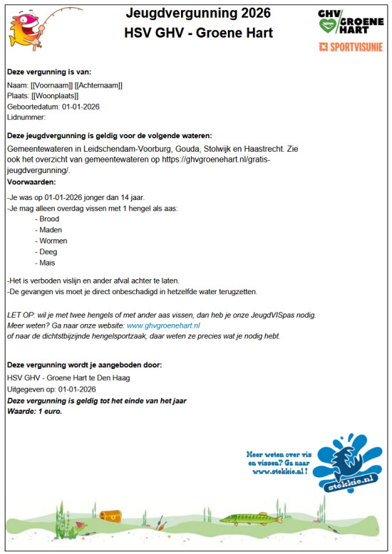 Ben je niet ouder dan 14 jaar (peildatum 1 januari) en vis je nooit met meer dan één hengel? Dan kun je een GRATIS jeugdvergunning van onze vereniging aanvragen, uitprinten en binnen 10 minuten kun je aan de waterkant zitten! Deze vergunning is geldig zonder (Jeugd)VISpas (lidmaatschap).