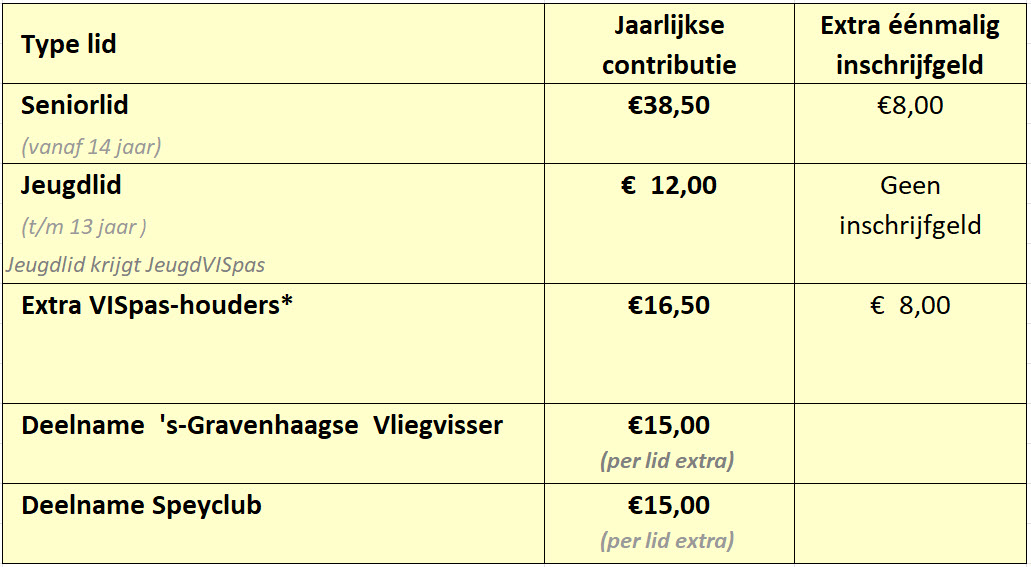 Hieronder zijn de kosten van het lidmaatschap 2026 van de vereniging vermeld. De kosten bestaan uit een jaarlijkse contributie (inclusief de afdracht aan de Sportvisunie) en een eenmalig inschrijfgeld.